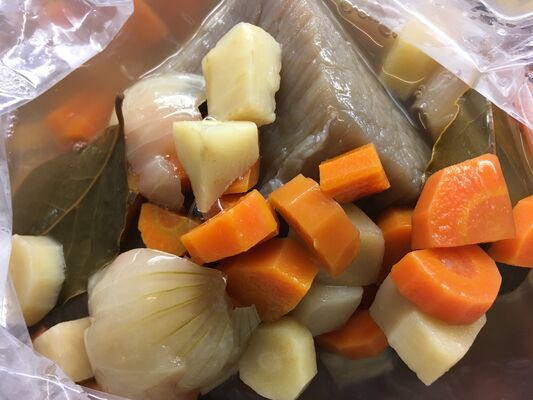 Fleisch aus dem Sud nehmen, trockentupfen und langsam braun anbraten. Mit dem Sud ablöschen und weiterhin langsam schmoren, immer den Sud zugießen. Die Zeit ist von der Größe des Stückes abhängig (2-3 Stunden). Eventuell Wasser oder Rotwein verwenden (nach persönlichen Vorlieben). Ca. 1/2 Stunde vor dem Ende auch das Gemüse aus dem Sud in die Sauce hinein geben.